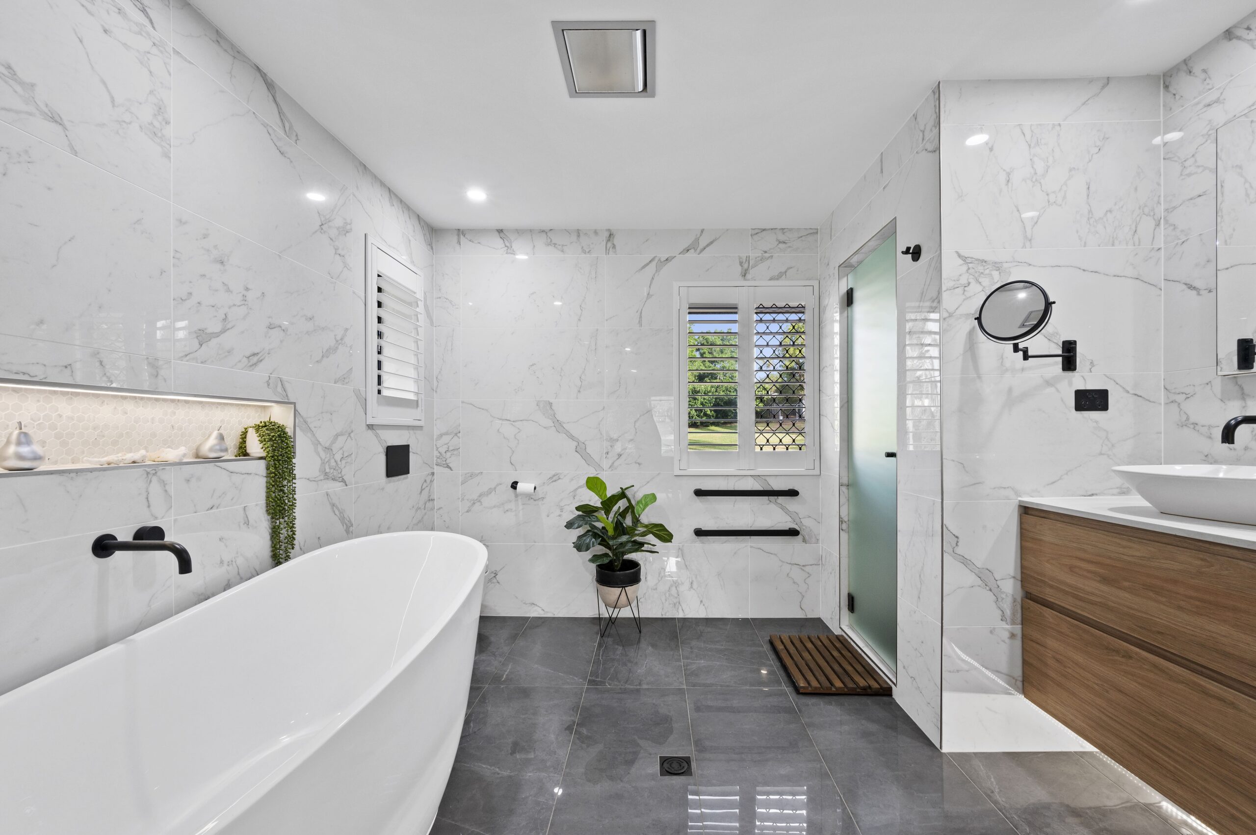 The master suite is a private sanctuary of luxury and calm. Beautifully finished with plantation shutters, a generous walk-in robe and a spacious open-plan ensuite with freestanding bath, it is a retreat designed for rest and indulgence. A private balcony captures elevated views and gentle breezes, offering a quiet place to begin and end each day. The main bathroom is equally impressive, featuring a full-sized bath and separate shower, thoughtfully designed to cater to family living. All remaining bedrooms have built-in robes and ceiling fans, creating comfortable, light-filled spaces for family and guests alike.