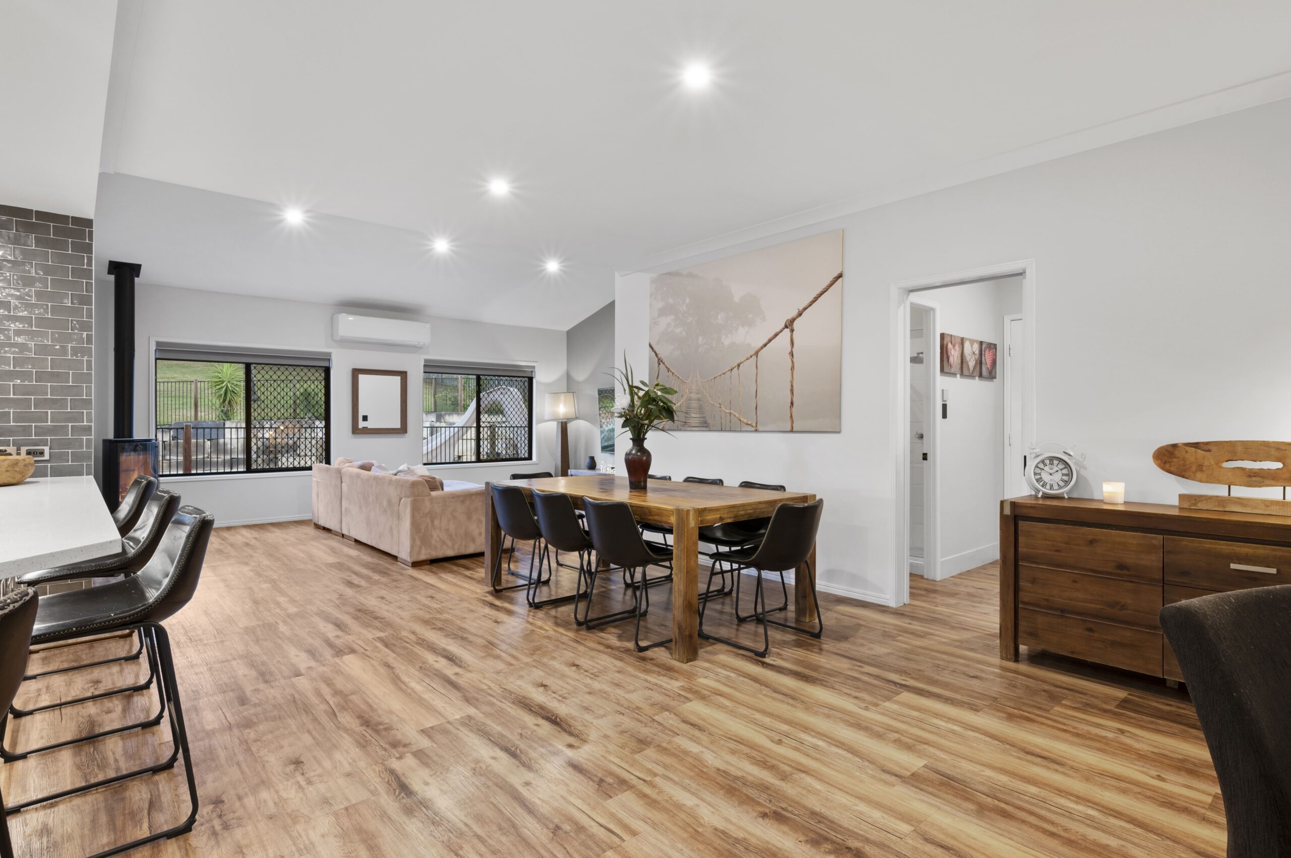 • Light-filled open-plan lounge and dining with feature fireplace