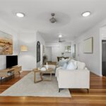At the heart of the home, a light-filled open plan living, dining and kitchen zone creates a refined yet welcoming space designed for everyday comfort and effortless entertaining. Bathed in natural light and enhanced by excellent airflow, this central hub offers a seamless connection between indoor living and the outdoor balcony beyond. The kitchen is both elegant and highly functional, featuring a breakfast bar, stainless steel appliances, gas cooktop and servery windows, perfectly designed to support entertaining with ease.