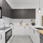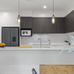 • Modern kitchen with sleek cabinetry + pendant lighting