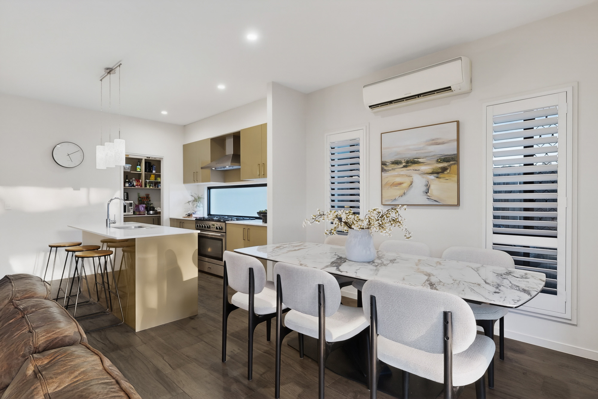 From the moment you step inside, the home impresses with its light-filled interiors and seamless open-plan layout. The heart of the home is the sophisticated kitchen, living, and dining zone – designed for both everyday living and entertaining. The kitchen is beautifully appointed with a large island bench, pendant lighting, walk-in pantry, and integrated bench seating, creating a warm yet luxurious central hub. Expansive sliding doors open completely to the covered alfresco area, blurring the line between indoor and outdoor living while overlooking the sparkling pool and landscaped backyard. A conveniently positioned bathroom off the living area enhances functionality for entertaining and poolside living.