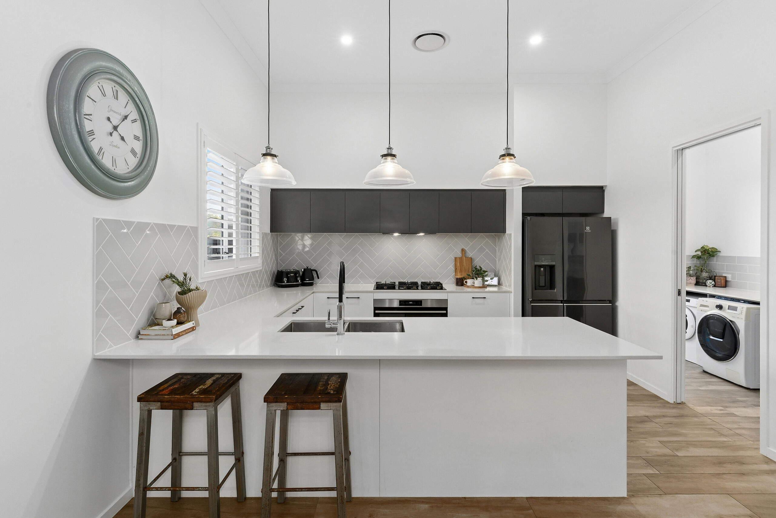 The kitchen is both functional and stylish, featuring generous cabinetry, quality finishes, and a central bench with bar seating, highlighted by elegant pendant lighting. A well-positioned laundry and pantry extend from the kitchen, providing additional practicality without compromising on design. Comfort is assured with ducted air conditioning, complemented by ceiling fans throughout the home and outdoor entertaining area.